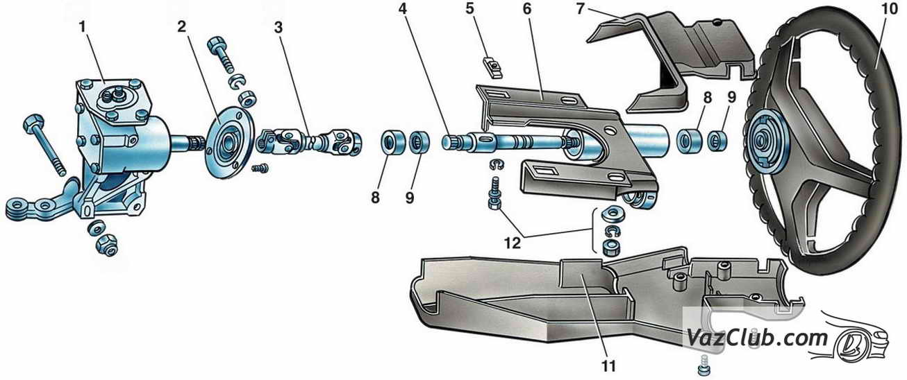 1 — картер рулевого механизма; 2 — уплотнитель вала; 3 — промежуточный вал; 4 — верхний вал; 5 — фиксирующая пластина передней части кронштейна; 6 — кронштейн крепления вала рулевого управления; 7 — верхняя часть облицовочного кожуха; 8 — втулка подшипника; 9 — подшипник; 10 — рулевое колесо; 11 — нижняя часть облицовочного кожуха; 12 — детали крепления кронштейна
