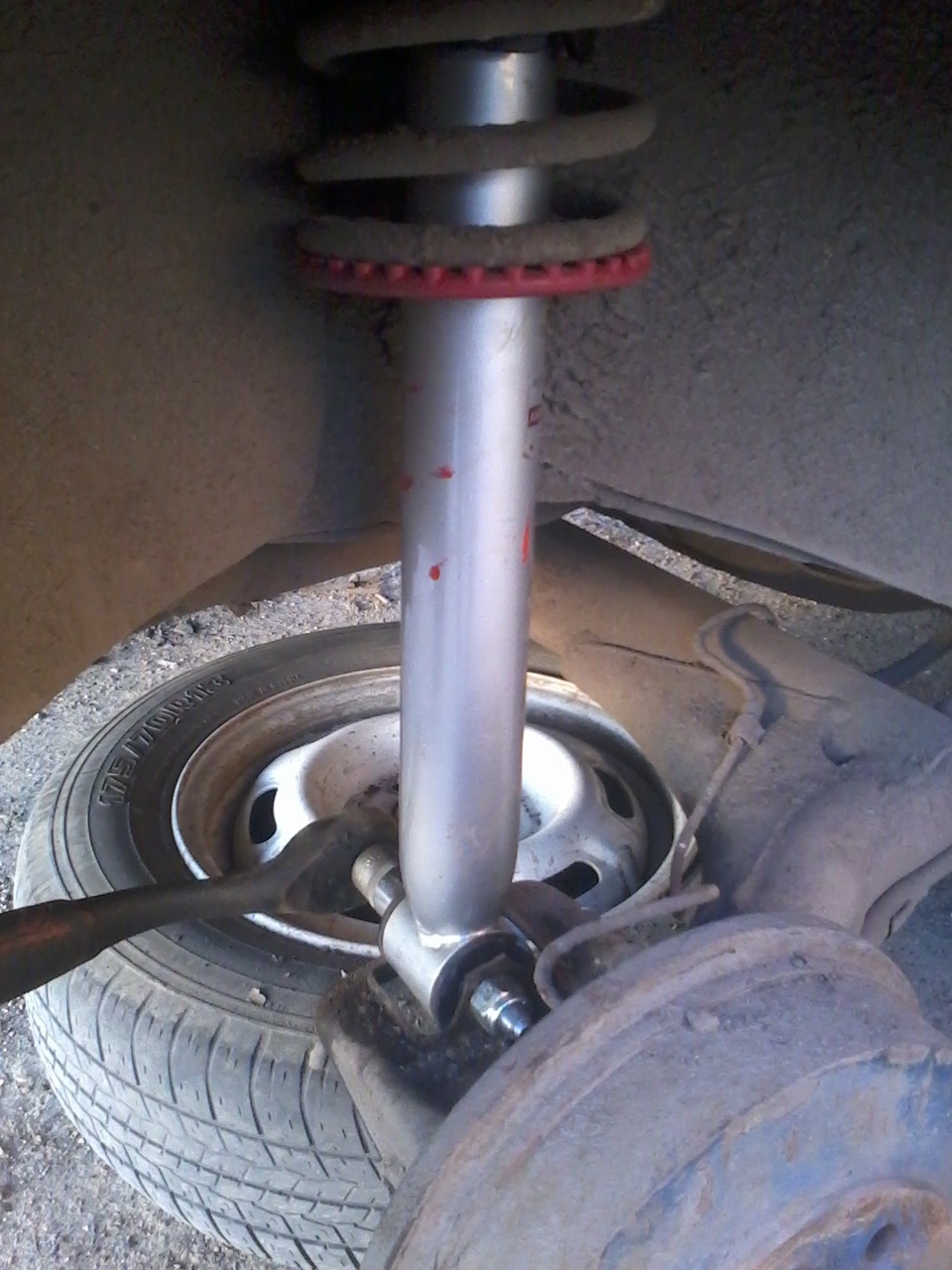- Теперь можно опустить машину на собственные колеса и полноценно затянуть болт нижнего крепления амортизатора.