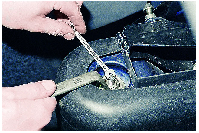 - Возьмите накидной ключ на 17 и рожковый ключ на 6. С их помощью вы сможете накидным открутить гайку, а рожковый пригодится для того, чтобы при этом придерживать шток амортизационной стойки.