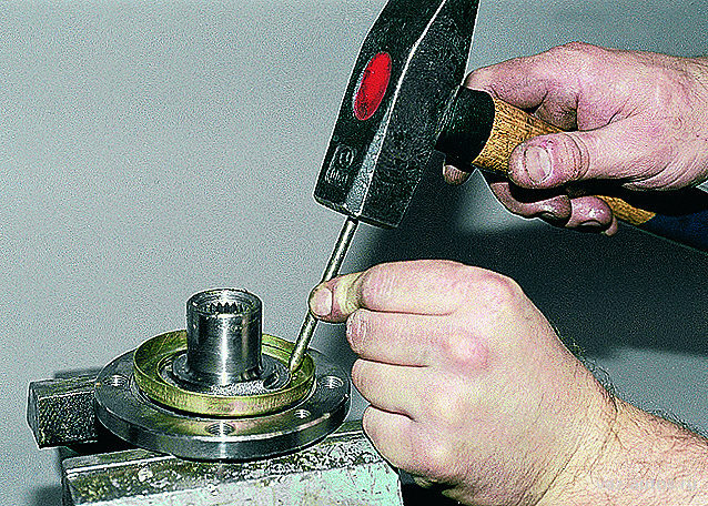 11. Этой же выколоткой необходимо извлечь подшипник из поворотного кулака. Чтобы сделать такую работу, придется заранее снять стопорные кольца. Они извлекаются любым подручным инструментом, например шилом. Хотя есть специальные зажимы для подобных целей.