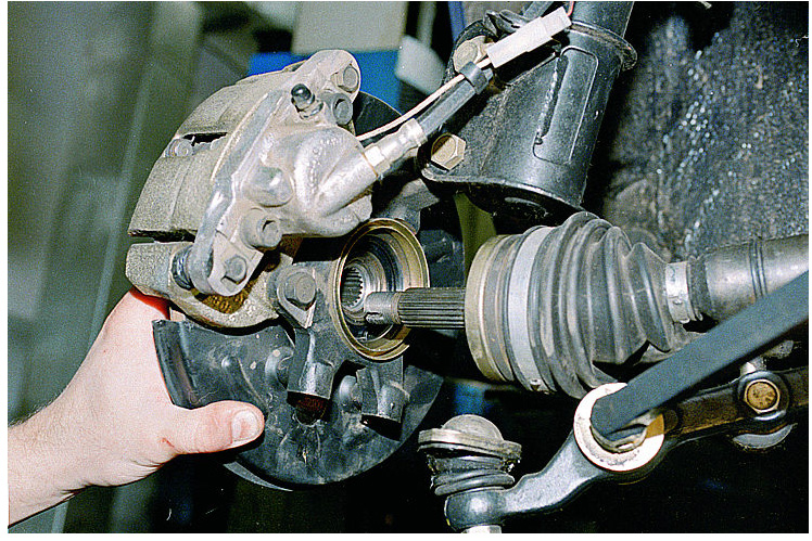 4. Снимите все, что может помешать вам демонтировать ступицу. К таковым объектам относится тормозной диск, крепление к поворотному кулаку, шаровой опоре, болты крепления поворотного кулака, крепежи передней стойки. Демонтируйте все это и двигайтесь дальше.