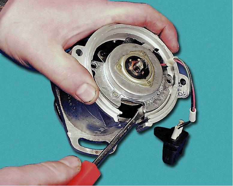 7. От датчика Холла идет питающий провод, удерживающийся лапками держателя. Отверткой лапки разжимаются, и провод извлекается. Далее нужно открутить пару крепежных винтов фиксации опорной пластины датчика Холла.