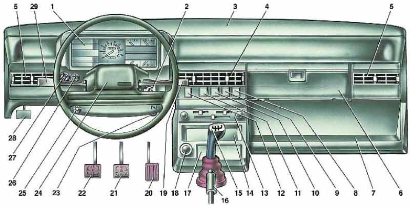 Что же касается комбинации приборов у ВАЗ 2109 с низкой панелью, то она имеет следующую схему.