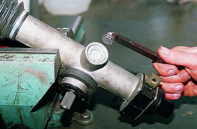 - Чтобы отрегулировать рулевую рейку, вам необходимо будет подтянуть регулировочный винт. Отыскать его вы сможете в рулевом механизме. Если быть конкретнее, то в торцевой крышке.