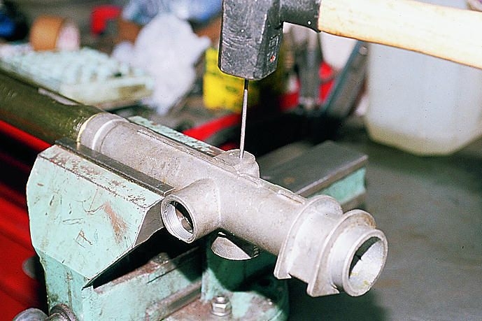 7. Наиболее сложным этапом считается замена игольчатого подшипника. Чтобы его снять, потребуется специальный ключ. Но можно обойтись без него. В этом случае вооружитесь сверлом на 1,5 миллиметра и дрелью. Сверлом выполните отверстие таким образом, чтобы ослабить торец подшипника. Пробоем выбейте старый подшип из картера.
