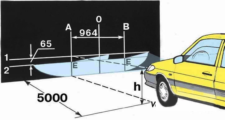 - Согласно инструкции, верхние края пятен света должны проходить по второй линии, а наклонные и горизонтальные участки совпадать в точках Е.
