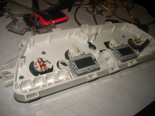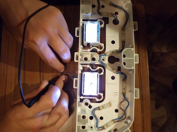 - Питание для светодиодов соединяют с питанием лампочек, надеваются стрелки и выставляются в нулевой показатель.