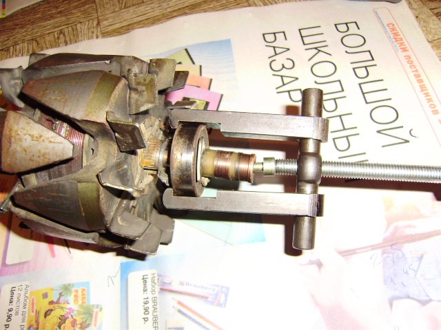 Первый подшипник мы рассмотрели. Второй завальцован на валу ротора. При поломке он подлежит замене. Устройство снимается специальным съемником и на его место монтируется новый подшипник |